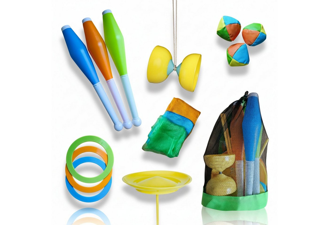 | Hauptinhalte | Hochwertige Jonglierbälle, Diabolo mit Schnur, Stoff-Jongliertücher, robuste Ringe, ausgewogene Keulen, drehfreudige Jonglierteller |
