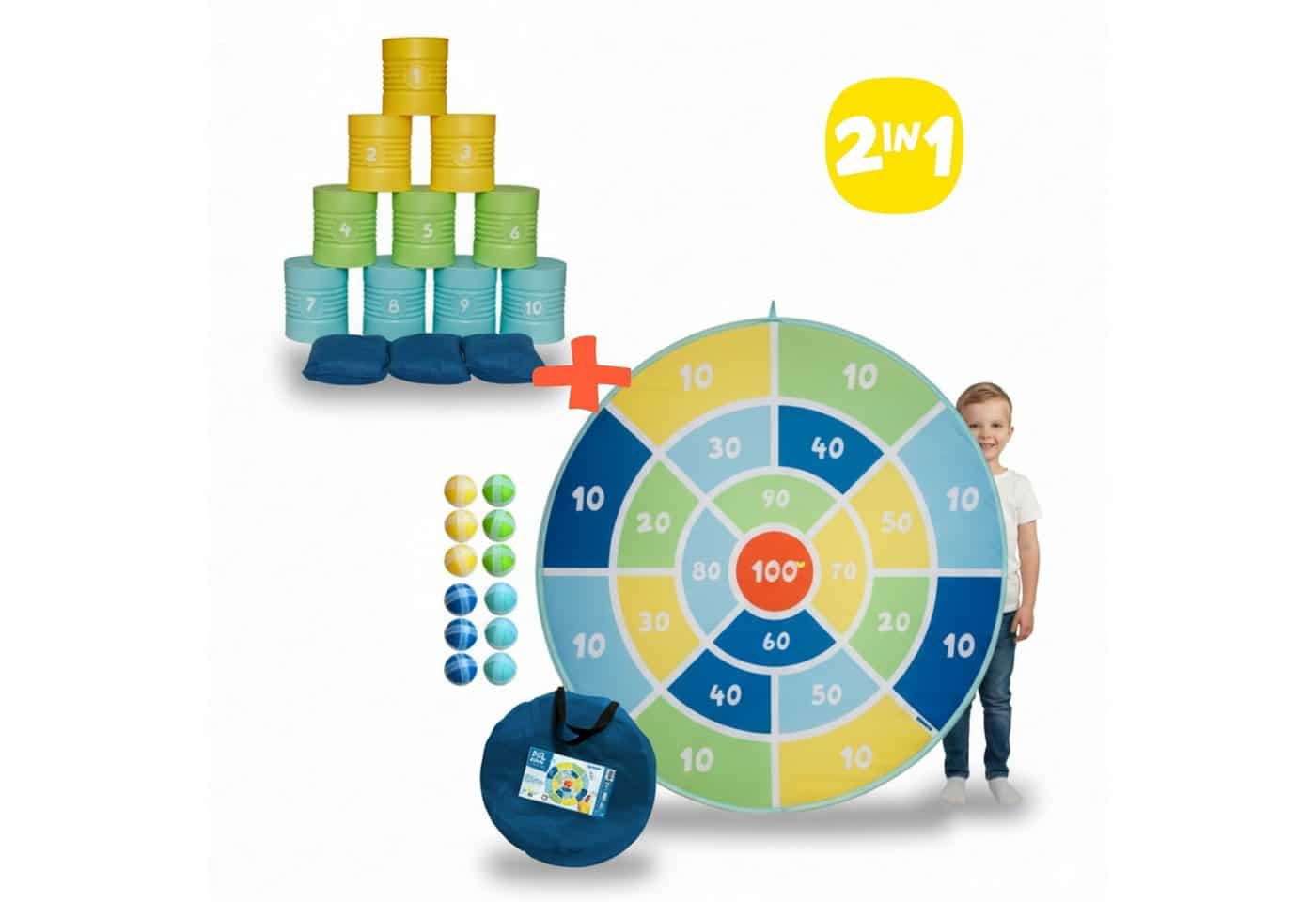 - Doppeltes Spielvergnügen: Mit Dosenwerfen und Klett-Dart kombiniert das Set zwei beliebte Spiele, die unterschiedliche Fähigkeiten fordern.