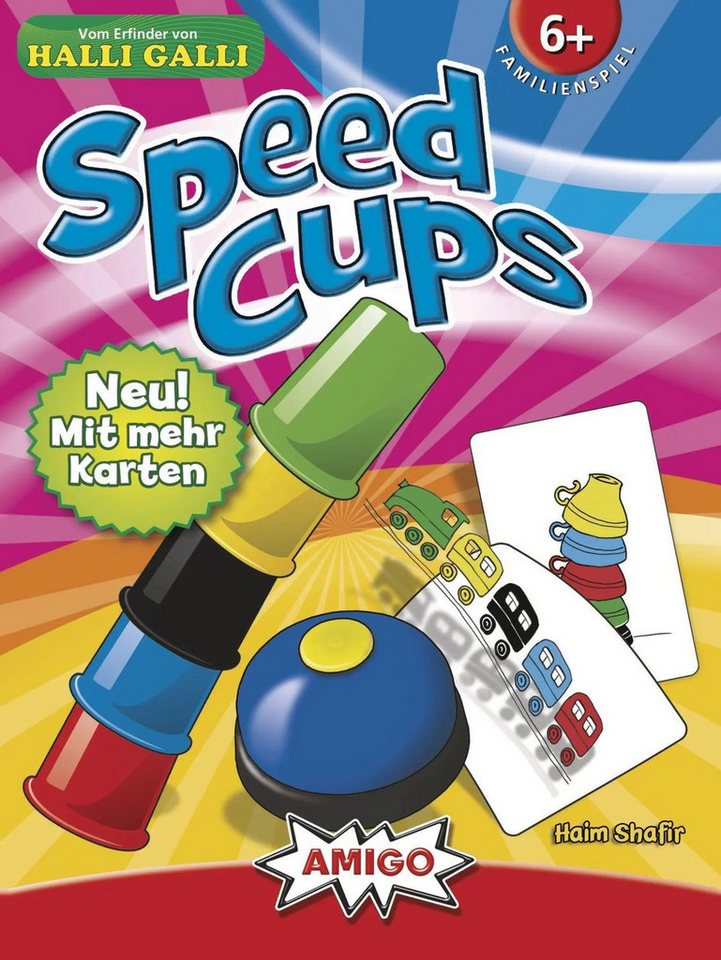 AMIGO Spiel Speed Cups fordert Spieler heraus, so schnell wie möglich die richtige Farbkombination auf ihren Bechern zu bilden. Anhand von Bildkarten müssen die Spieler ihre fünf bunten Becher in der exakt vorgegebenen Reihenfolge stapeln und dann so schnell wie möglich das Klingel-Symbol drücken. Wer dies zuerst und korrekt erledigt, sammelt die Karte und gewinnt das Spiel. Die Simplizität des Regelwerks macht Speed Cups sofort zugänglich, doch die steigende Komplexität der Karten und der zunehmende Wettkampf sorgen für langanhaltende Spannung und Wiederspielwert.