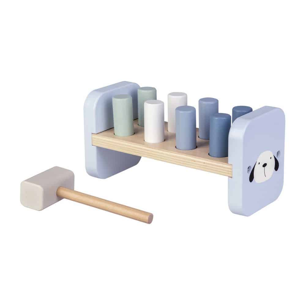 | Design & Ästhetik | Klassisches Hammerspiel-Design mit einem robusten Holzbrett und farblich abgesetzten Holzdübeln in Blau (oder weiteren Farben, falls zutreffend) sowie einem passenden Holzhammer. Die Farbgebung ist hell und kindgerecht. Die Gesamtform ist ergonomisch gestaltet für kleine Kinderhände. |