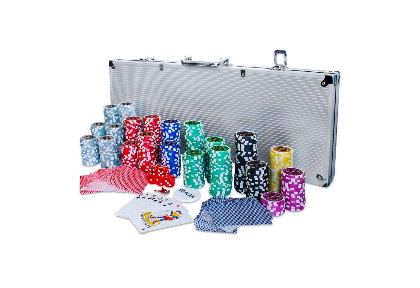 - Umfangreiches Set: Enthält alles Notwendige für ein professionelles Pokerspiel, inklusive 500 Chips, Kartendecks und Würfeln.