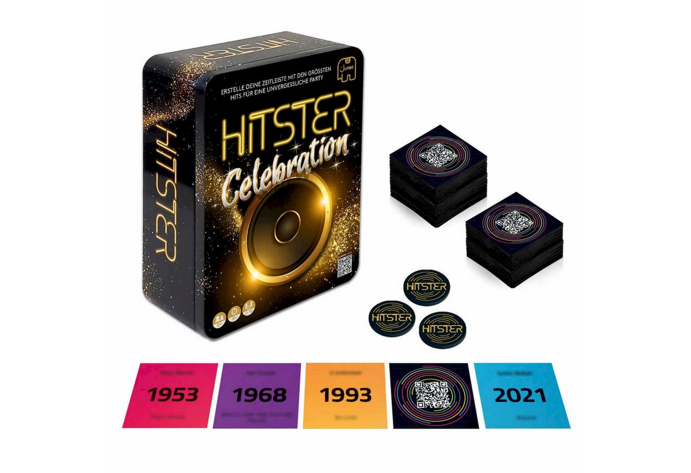 Die Jumbo Spiele Spielesammlung Hitster Celebration ist ein Musik-Ratespiel für Gesellschaftsabende, bei dem die Spieler die Jahreszahl der abgespielten Songs erraten müssen, um sie in ihrer Zeitleiste richtig zu platzieren. Die Celebration Edition konzentriert sich auf die populärsten und bekanntesten Hits.