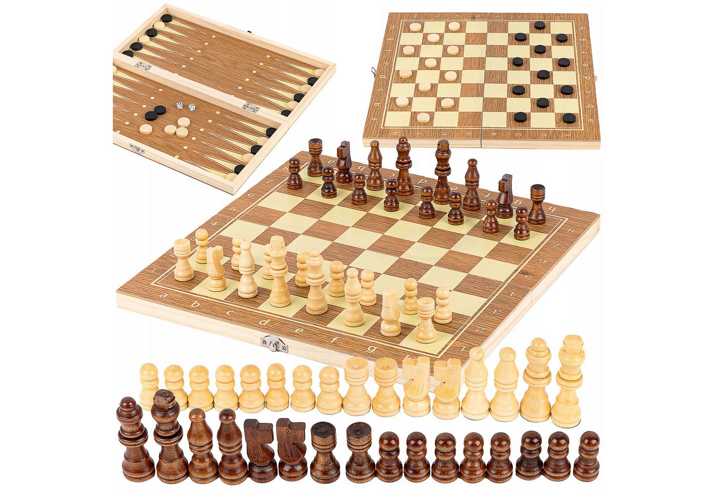 In der Regel ist bei solchen 3-in-1 Sammlungen das Hauptbrett für zwei der Spiele (oft Schach und Dame) konzipiert, während das dritte Spiel (Backgammon) entweder auf der Rückseite oder auf einer separaten, integrierten Spielfläche untergebracht ist. Die genaue Konfiguration kann variieren, aber das Ziel ist meist eine kompakte und funktionale Lösung.