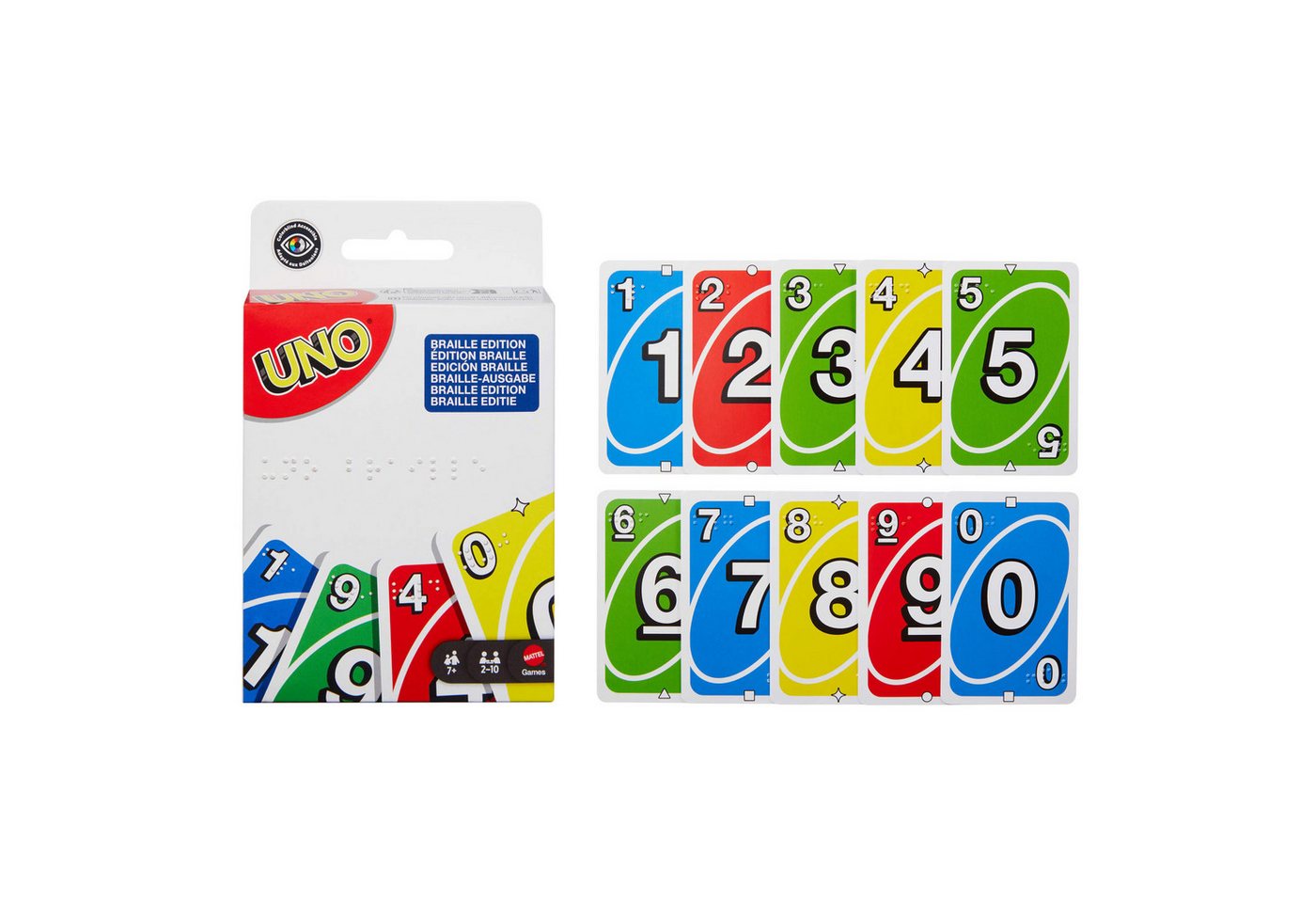 | Spielregeln | Vollständig kompatibel mit den offiziellen UNO-Spielregeln. Eine separate Anleitung in Brailleschrift ist optional erhältlich oder über digitale Ressourcen zugänglich. |