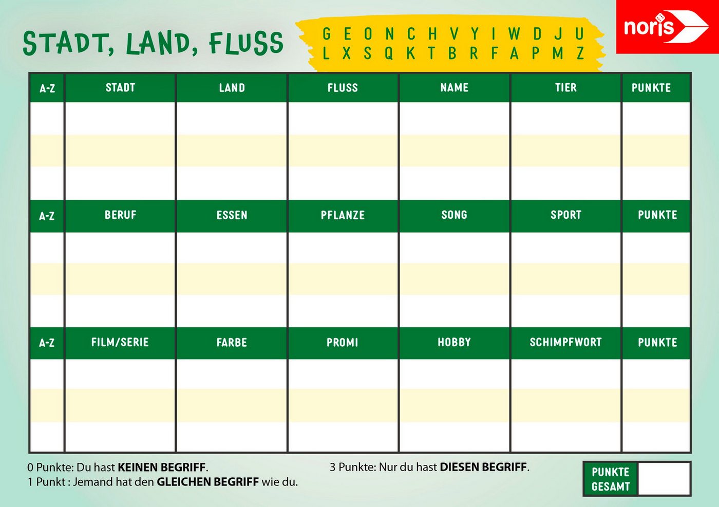 - Klare Gliederung der Kategorien: Die vorgegebenen Kategorien sind übersichtlich angeordnet, was das Ausfüllen der Felder erleichtert und den Spielfluss beschleunigt.