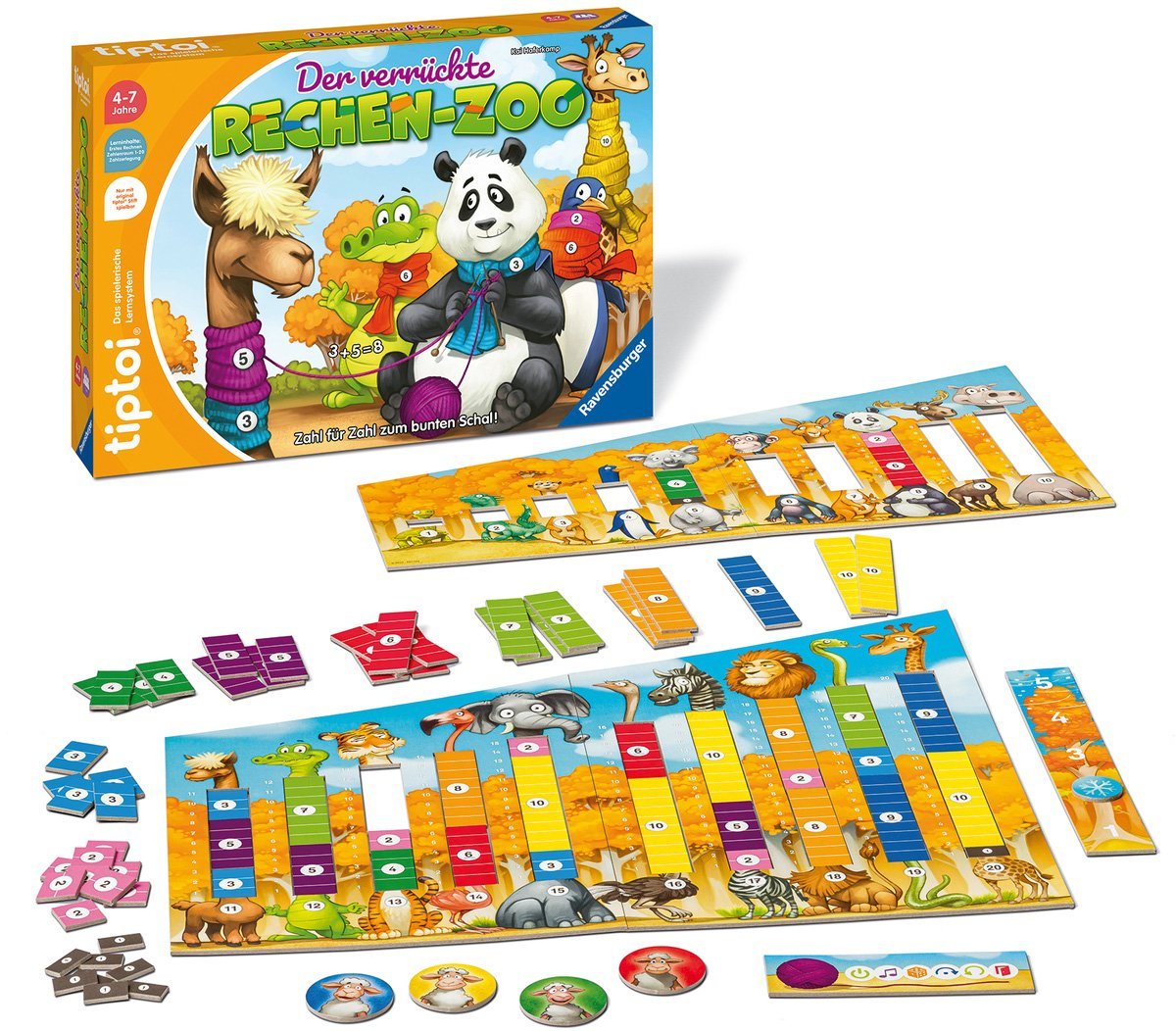 | Design-Merkmale | Farbintensives, kindgerechtes Design mit detailreichen Illustrationen des verrückten Rechen-Zoos. Klare Symbole und gut lesbare Zahlen. |