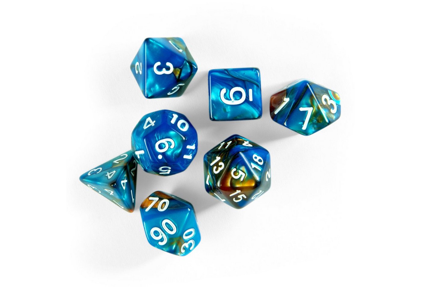 | Set-Inhalt | 7 polyedrische Würfel: 1x d4, 1x d6, 1x d8, 1x d10, 1x d%, 1x d12, 1x d20 |