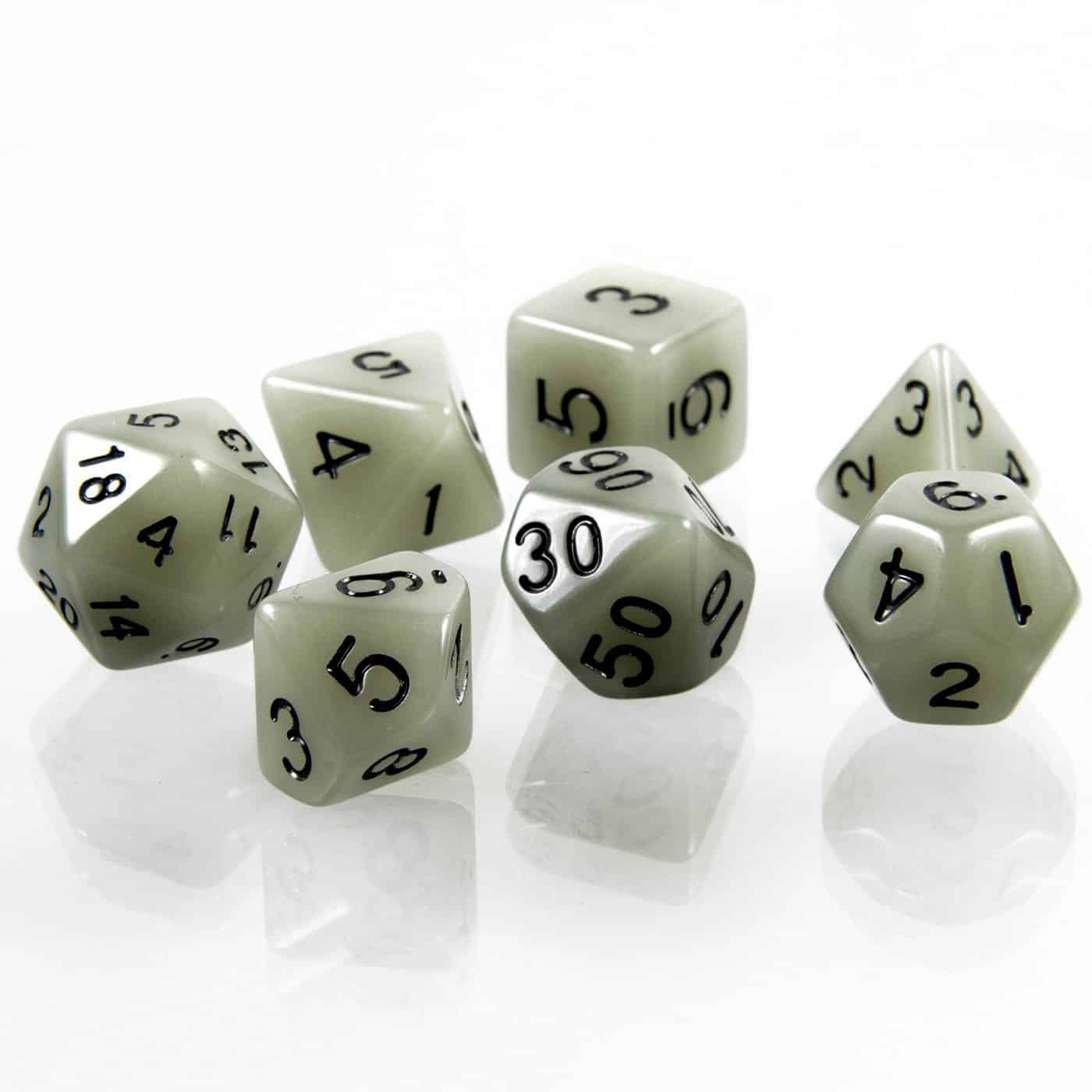 | Design-Merkmale: | Polyedrische Formgebung mit 7 verschiedenen Würfeln (d4, d6, d8, d10, d10%ile, d12, d20). Klare Kanten und gut sichtbare, kontrastierende Zahlen. Phosphoreszierende Eigenschaft für Leuchteffekte im Dunkeln. |