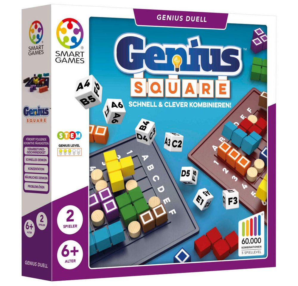 Genius Square ist ein Spiel für die ganze Familie und jeden, der seine Denkfähigkeiten verbessern möchte. Kinder ab 8 Jahren profitieren enorm von der Förderung des räumlichen Denkens und der Problemlösungsstrategien, die für den schulischen Erfolg und die allgemeine kognitive Entwicklung unerlässlich sind. Aber auch Erwachsene finden in Genius Square eine anspruchsvolle und befriedigende Herausforderung. Es ist eine ideale Beschäftigung für gemütliche Abende, lange Zugfahrten oder als geistige Übung im Büro. Wer nach einer Möglichkeit sucht, die Konzentration zu steigern, das logische Denken zu schulen und dabei noch Spaß zu haben, wird von Genius Square begeistert sein.