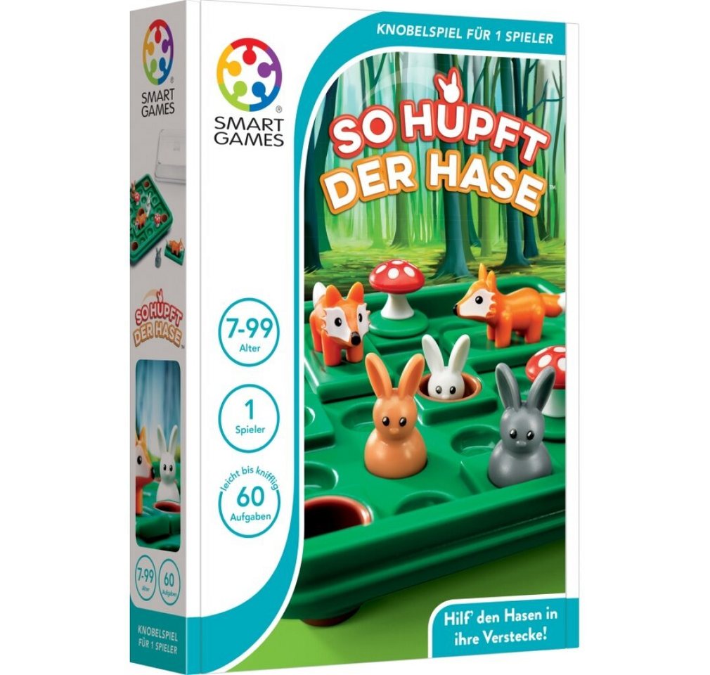 Smart Games Spiel So hüpft der Hase basiert auf einem genial einfachen, aber herausfordernden Prinzip. Die Aufgabe besteht darin, einen kleinen Hasen über verschiedene Hindernisse hinweg in sein sicheres Zuhause zu manövrieren. Dies geschieht durch das geschickte Platzieren und Bewegen von Hindernissen, die den Sprungweg des Hasen vorgeben oder blockieren. Die Herausforderung liegt darin, die richtige Kombination und Reihenfolge der Elemente zu finden, um das Ziel zu erreichen. Jede der 60 Aufgabenkarten präsentiert ein einzigartiges Szenario, das schrittweise komplexer wird und so eine kontinuierliche Entwicklung der Problemlösungsfähigkeiten gewährleistet.