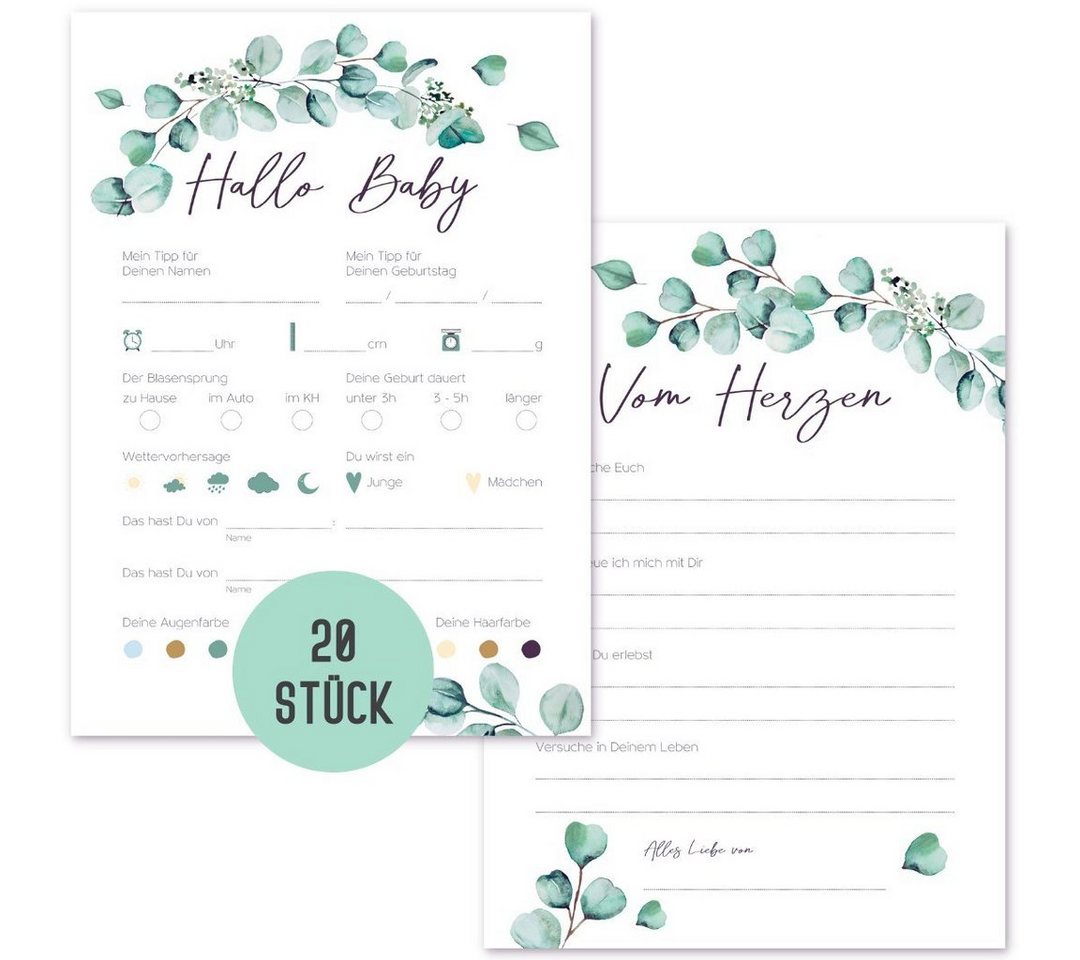 Die Karten sind so konzipiert, dass sie einfach auszufüllen sind. Es gibt vorgegebene Felder für Schätzungen wie Geburtsdatum, Gewicht, Größe, Augenfarbe, Haarfarbe und den Namen des Babys. Zusätzlich gibt es Raum für persönliche Botschaften, Ratschläge oder Wünsche an die werdende Familie und das Baby.