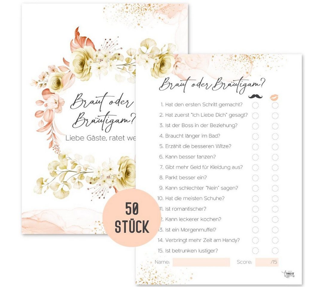 Das Things of Happiness Spiel Hochzeitsspiel Braut & Bräutigam zeichnet sich durch seine durchdachte Konzeption und hochwertige Verarbeitung aus. Jede der 50 Karten wurde mit Bedacht erstellt, um maximale Interaktion und Spaß zu gewährleisten. Das Design ist elegant und passt zu jedem Hochzeitsstil.